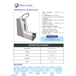 Le distributeur de surchaussures est un dispositif mécanique pratique et silencieux, permettant une distribution facile et rapide de surchaussures à usage unique. Avec une capacité allant jusqu'à 200 surchaussures, il garantit une hygiène optimale et peut être installé dans divers environnements. Son entretien est simple et il est compatible avec des produits de nettoyage industriels.